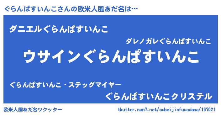 | 女子向けラノベタイトル風あだ名 | 『ぐらんぱすいんこの卵を拾いまして』 |