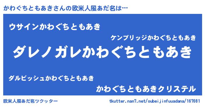 | 男性向けラノベタイトル風あだ名 | 『魔弾の王とかわぐちともあき』 |