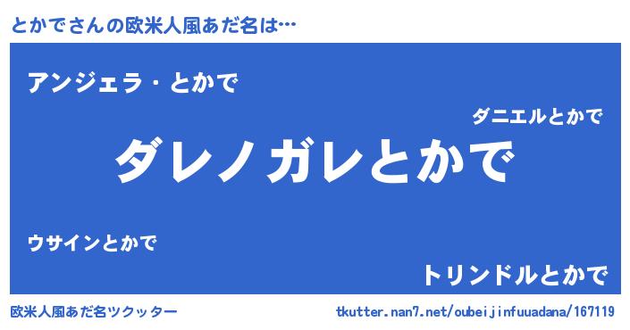| 男性向けラノベタイトル風あだ名 | 『魔弾の王ととかで』『トカデスレイヤー』 |