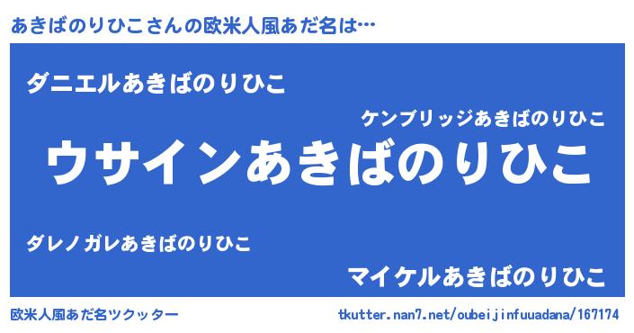 | 男性向けラノベタイトル風あだ名 | 『あきばのりひこの嫁は女の子じゃないと思った?』 |