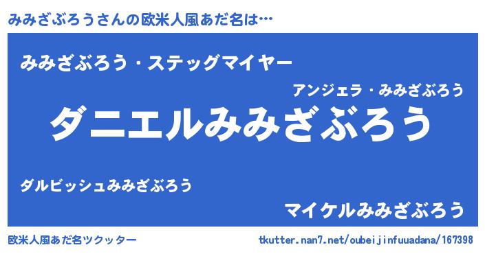 | 男性向けラノベタイトル風あだ名 | 『おまえをオタクにしてやるから、俺をみみざぶろうにしてくれ! 』 |