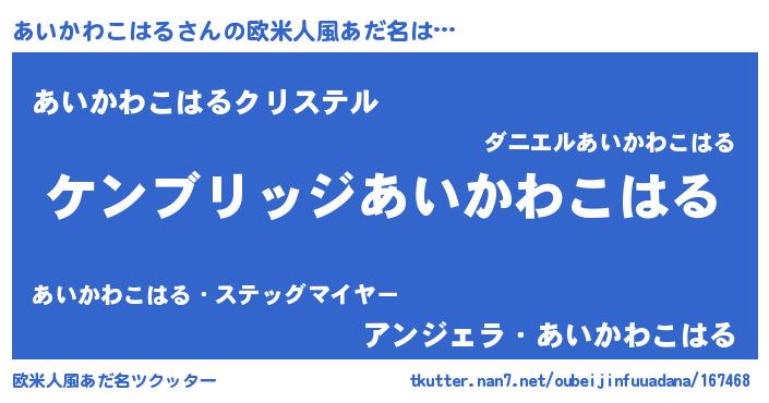 | 男性向けラノベタイトル風あだ名 | 『Re:あいかわこはるから始める異世界生活』 |