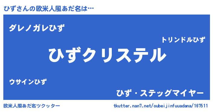 | 女子向けラノベタイトル風あだ名 | 『ひず伯爵の花嫁』『ひずの玉の輿計画!』 |