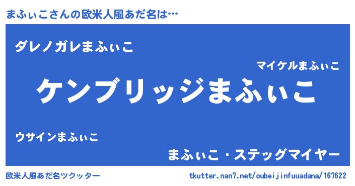 | 男性向けラノベタイトル風あだ名 | 『Re:まふぃこから始める異世界生活』 |