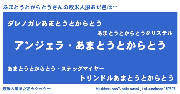 | 意味不明あだ名 | 『住所不定無職あまとうとからとう(86歳)』 |