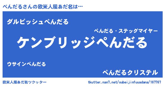 | 男性向けラノベタイトル風あだ名 | 『Re:ぺんだるから始める異世界生活』 |