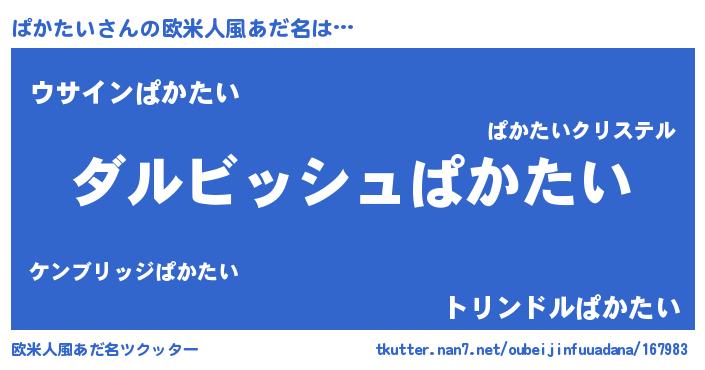 | 男性向けラノベタイトル風あだ名 | 『ぱかたいという概念が存在しない退屈な世界 』 |