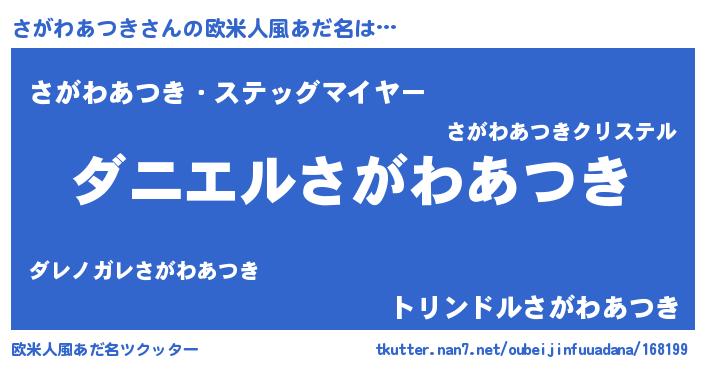 | 男性向けラノベタイトル風あだ名 | 『おまえをオタクにしてやるから、俺をさがわあつきにしてくれ! 』 |