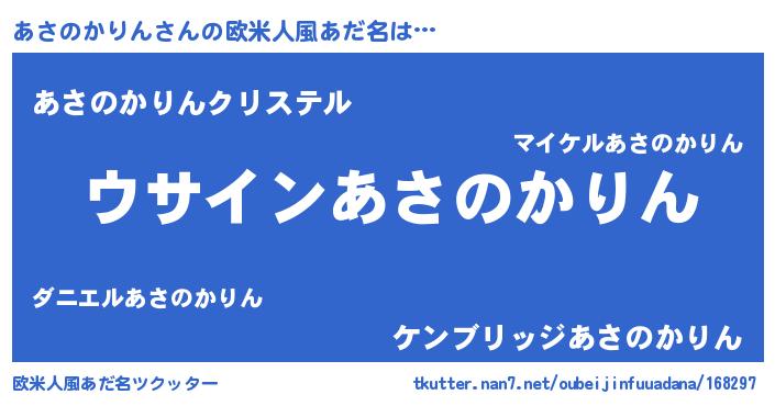 | 男性向けラノベタイトル風あだ名 | 『あさのかりんの嫁は女の子じゃないと思った?』 |