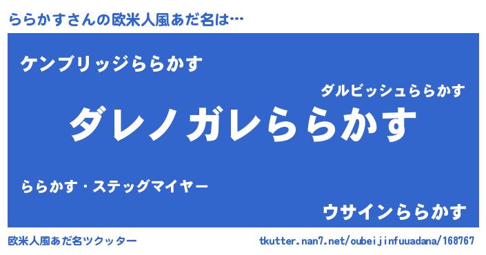 | 男性向けラノベタイトル風あだ名 | 『魔弾の王とららかす』 |