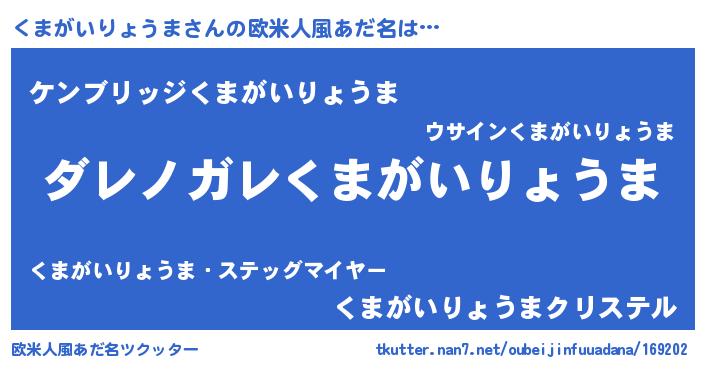 | 女子向けラノベタイトル風あだ名 | 『乙女ゲームの破滅フラグしかない悪役くまがいりょうまに転生してしまった…』 |