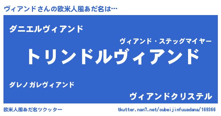 | 男性向けラノベタイトル風あだ名 | 『ヴィアンド~年齢イコール彼女いない歴の魔法使い~』 |