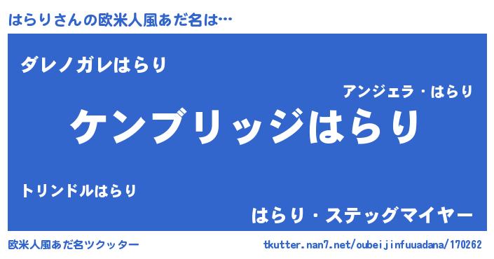 | 男性向けラノベタイトル風あだ名 | 『Re:はらりから始める異世界生活』 |
