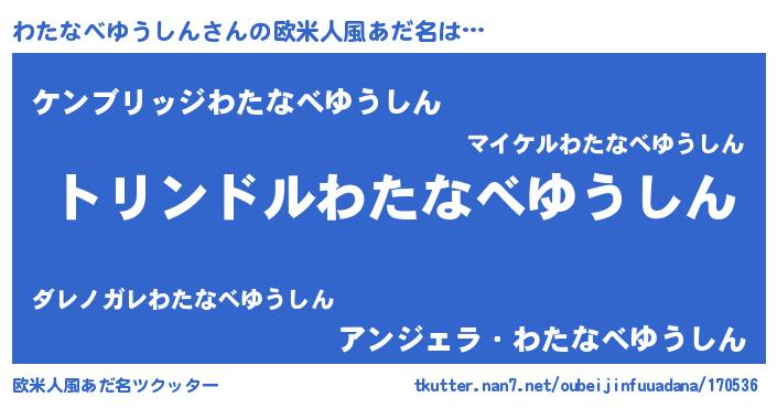 | 男性向けラノベタイトル風あだ名 | 『転生したらわたなべゆうしんだった件』 |