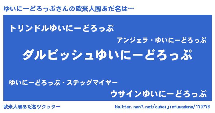 | 男性向けラノベタイトル風あだ名 | 『ゆいにーどろっぷという概念が存在しない退屈な世界 』 |