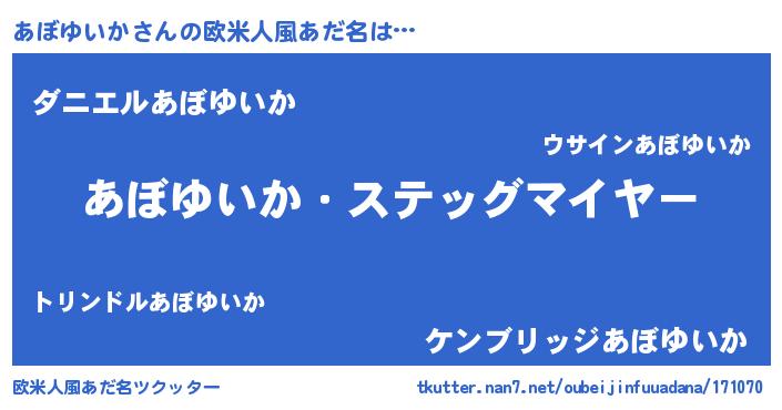| 男性向けラノベタイトル風あだ名 | 『うちのあぼゆいかが世界を掌握している!』 |