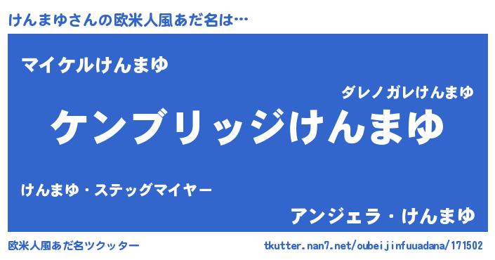 | 男性向けラノベタイトル風あだ名 | 『Re:けんまゆから始める異世界生活』 |