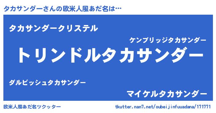 | 男性向けラノベタイトル風あだ名 | 『タカサンダー~年齢イコール彼女いない歴の魔法使い~』 |