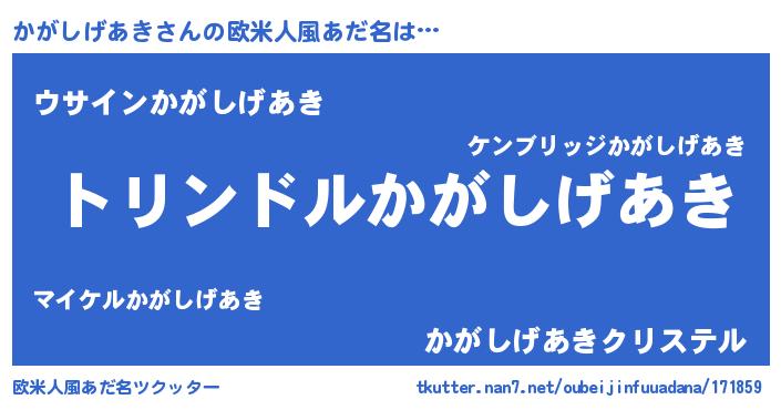 | 女子向けラノベタイトル風あだ名 | 『かがしげあきの玉の輿計画!』 |
