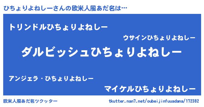 | 男性向けラノベタイトル風あだ名 | 『ひちょりよねしーという概念が存在しない退屈な世界 』 |