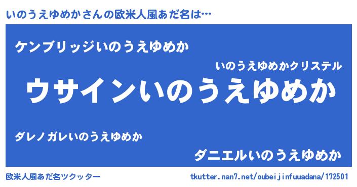 | 男性向けラノベタイトル風あだ名 | 『いのうえゆめかの嫁は女の子じゃないと思った?』 |