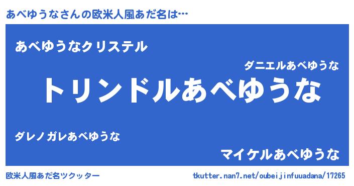 | 男性向けラノベタイトル風あだ名 | 『あべゆうな~年齢イコール彼女いない歴の魔法使い~』 |
