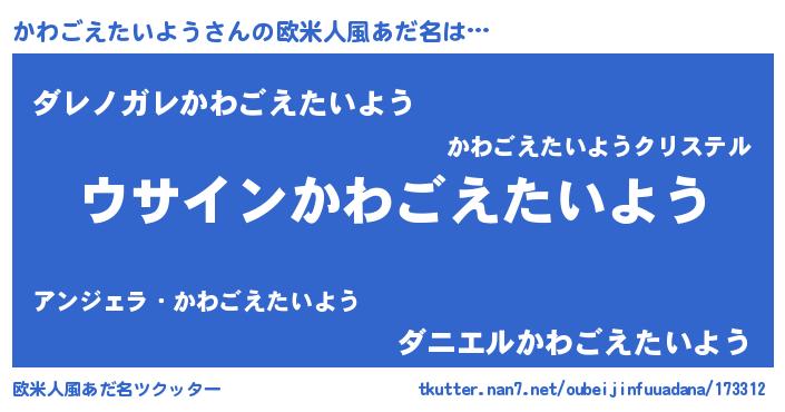 | 男性向けラノベタイトル風あだ名 | 『かわごえたいようの嫁は女の子じゃないと思った?』 |