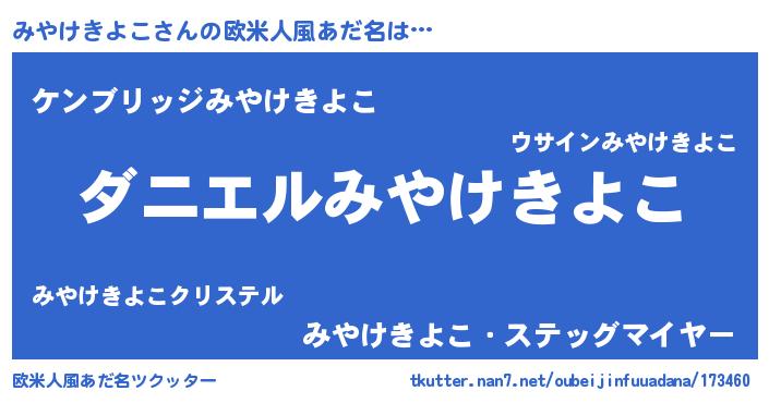 | 男性向けラノベタイトル風あだ名 | 『おまえをオタクにしてやるから、俺をみやけきよこにしてくれ! 』 |