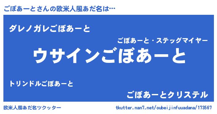 | 男性向けラノベタイトル風あだ名 | 『ごぼあーとの嫁は女の子じゃないと思った?』 |