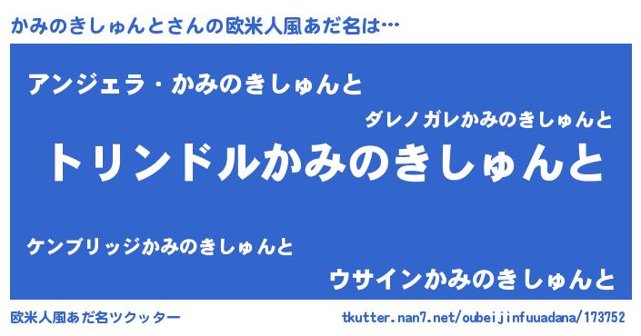 | 男性向けラノベタイトル風あだ名 | 『かみのきしゅんと~年齢イコール彼女いない歴の魔法使い~』 |