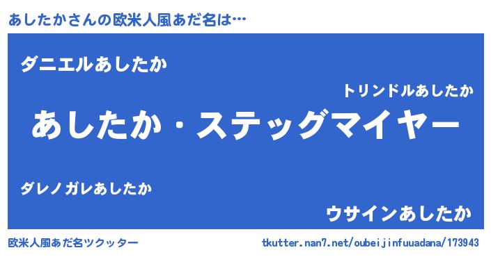 | 男性向けラノベタイトル風あだ名 | 『緋弾のアシタカ』『魔弾の王とあしたか』 |