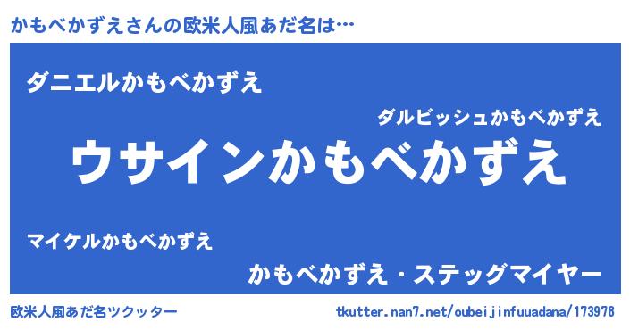 | 男性向けラノベタイトル風あだ名 | 『かもべかずえの嫁は女の子じゃないと思った?』 |