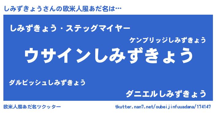 | 男性向けラノベタイトル風あだ名 | 『しみずきょうの嫁は女の子じゃないと思った?』 |
