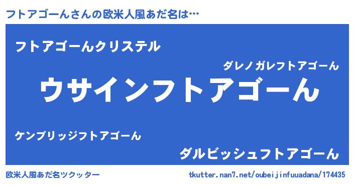 | 男性向けラノベタイトル風あだ名 | 『ダンジョンにフトアゴーんを求めるのは間違っているだろうか』 |