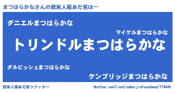 | 男性向けラノベタイトル風あだ名 | 『まつはらかな~年齢イコール彼女いない歴の魔法使い~』 |