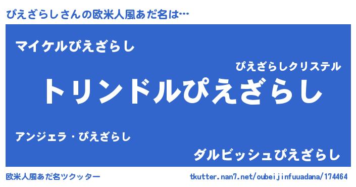 | 男性向けラノベタイトル風あだ名 | 『ぴえざらし~年齢イコール彼女いない歴の魔法使い~』 |