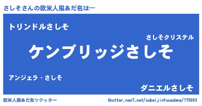 | 男性向けラノベタイトル風あだ名 | 『Re:さしそから始める異世界生活』 |