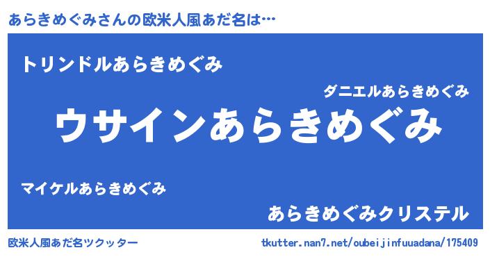 | 男性向けラノベタイトル風あだ名 | 『あらきめぐみの嫁は女の子じゃないと思った?』 |