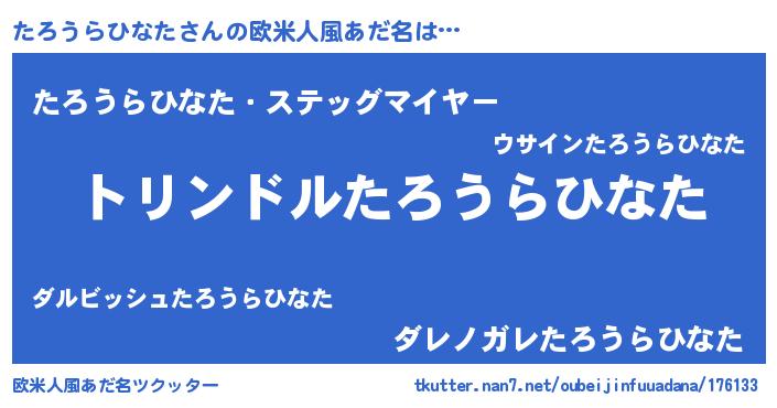 | 男性向けラノベタイトル風あだ名 | 『たろうらひなた~年齢イコール彼女いない歴の魔法使い~』 |