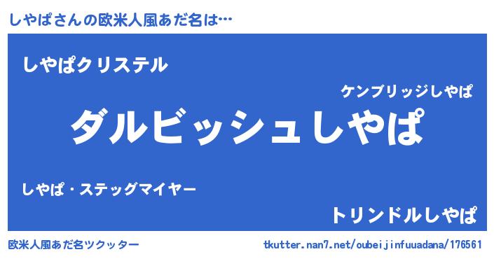 | 女子向けラノベタイトル風あだ名 | 『しやぱの契約王妃』『しやぱ伯爵の花嫁』 |