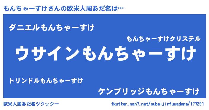 | 男性向けラノベタイトル風あだ名 | 『もんちゃーすけの嫁は女の子じゃないと思った?』 |
