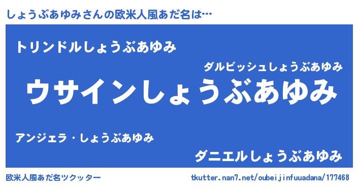 | 女子向けラノベタイトル風あだ名 | 『しょうぶあゆみの卵を拾いまして』 |