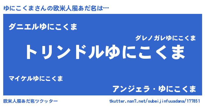| 男性向けラノベタイトル風あだ名 | 『ゆにこくま~年齢イコール彼女いない歴の魔法使い~』 |