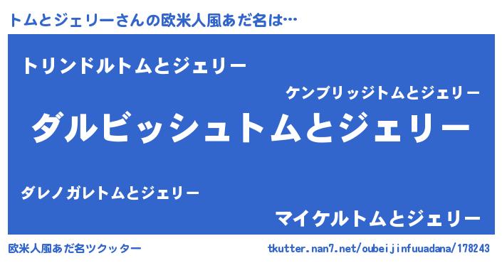 | 男性向けラノベタイトル風あだ名 | 『トムとジェリーという概念が存在しない退屈な世界 』 |