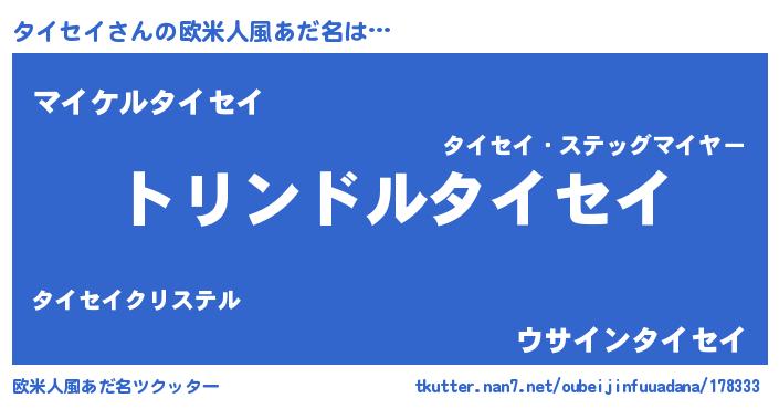 | 男性向けラノベタイトル風あだ名 | 『タイセイ~年齢イコール彼女いない歴の魔法使い~』 |