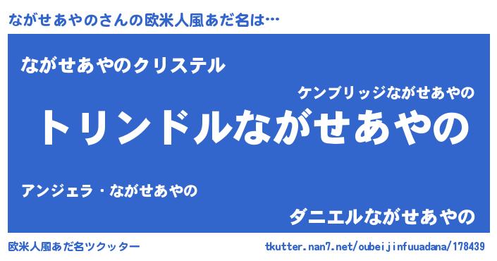 | 男性向けラノベタイトル風あだ名 | 『ながせあやの~年齢イコール彼女いない歴の魔法使い~』 |