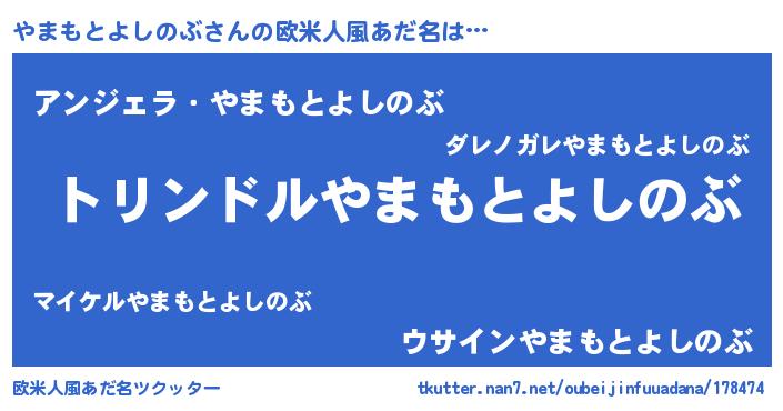 | 男性向けラノベタイトル風あだ名 | 『やまもとよしのぶ~年齢イコール彼女いない歴の魔法使い~』 |