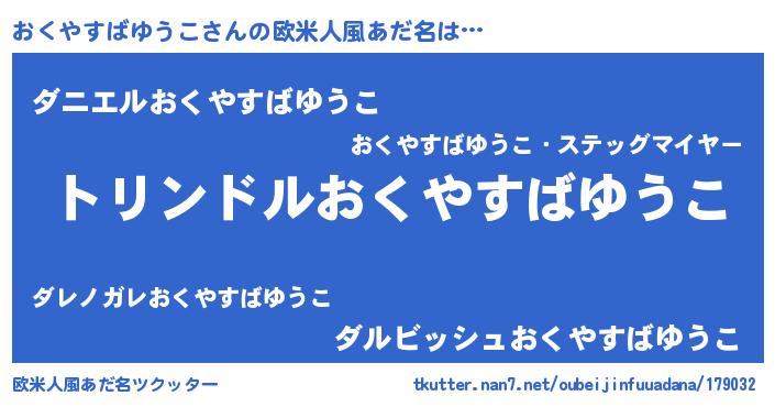 | 男性向けラノベタイトル風あだ名 | 『おくやすばゆうこ~年齢イコール彼女いない歴の魔法使い~』 |