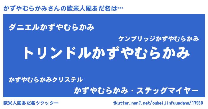| 男性向けラノベタイトル風あだ名 | 『かずやむらかみ~年齢イコール彼女いない歴の魔法使い~』 |