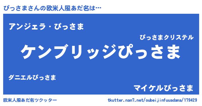 | 男性向けラノベタイトル風あだ名 | 『Re:ぴっさまから始める異世界生活』 |